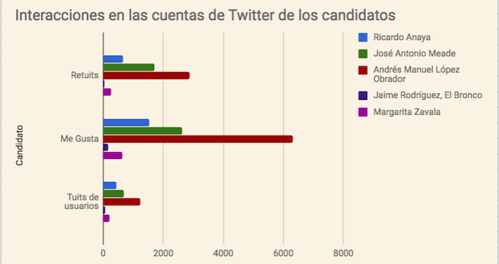 El estudio gráfico del comportamiento de la cuenta de Anaya en Twitter destaca que el número de interacciones que genera está por debajo de las de José Antonio Meade y de Andrés Manuel López Obrador.