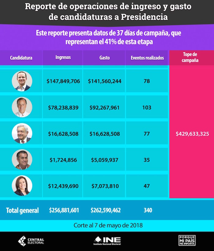 De acuerdo con el INE, los candidatos han gastado en publicidad un total de 262 millones 590 mil de pesos, lo que corresponde a un avance del 41 por ciento de la etapa electoral, que tiene como tope 429 millones 633 pesos.