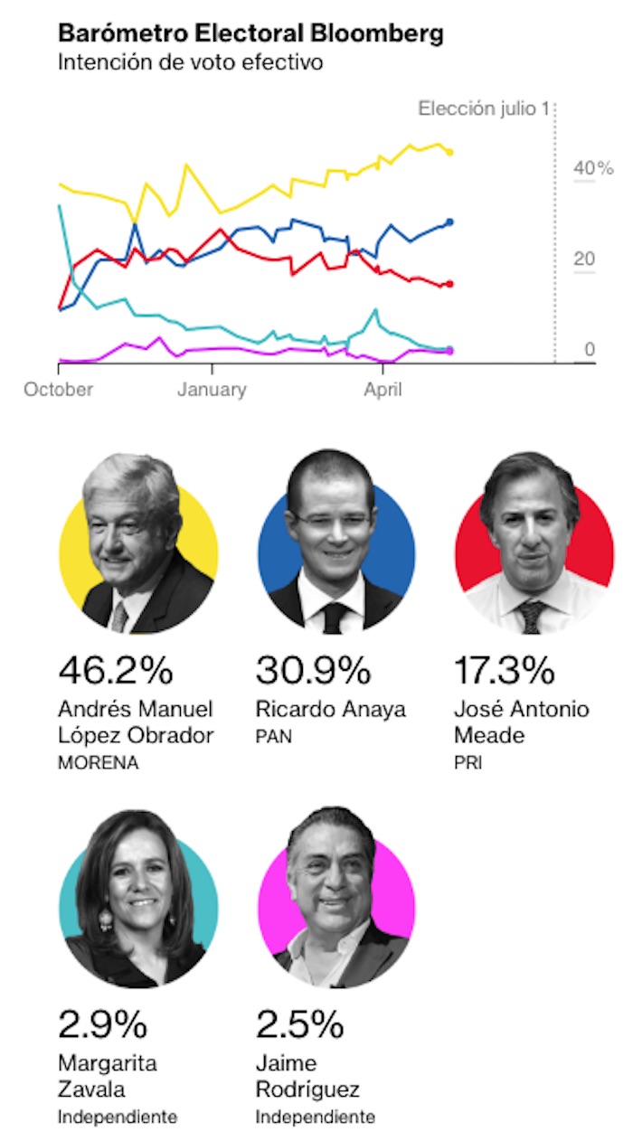 Ciudad de México, 8 de mayo (SInEmbargo).– Ricardo Anaya Cortés, candidato de los partidos Acción Nacional (PAN), de la Revolución Democrática (PRD) y de Movimiento Ciudadano (MC) subió un punto porcentual, el mismo que bajó Andrés Manuel López Obrador en el consolidado de encuestas que realiza la empresa de medios Bloomberg.