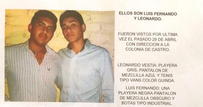 Los jóvenes Luis Fernando y Leonardo Segura Nieto de 19 y 18 años de edad respectivamente, se les vio por última vez en el domicilio de Luis en la colonia los Naranjos, de donde salieron de manera normal.