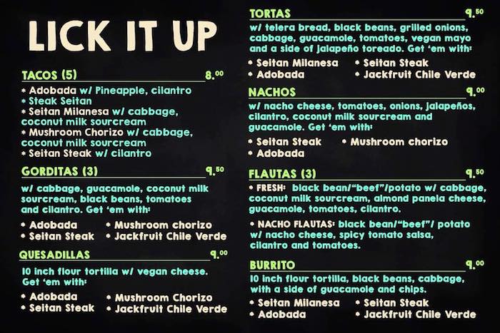 A primera vista, Lick It Up EP parece un agujero punk para comer, pero una mirada más detallada revela algo especial. En lugar de los amenazantes platillos veganos de siempre como el 'stir-fry', el tofu en mil presentaciones o las hamburguesas de frijoles negros, el menú es como andar por las calles de El Paso/Juárez: tortas de milanesa, flautas de papa, gorditas fritas, tacos de carne adobada, nachos y jalapeños toreados para devorar entre tragos de cerveza.