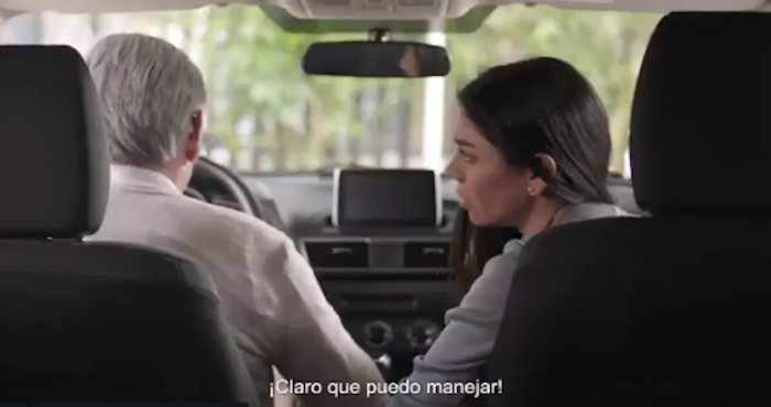 El hombre maneja un automóvil, mientras la mujer, supuesta hija de éste, lo exhorta a no hacerlo debido a su avanzada edad: "Pa, te hemos dicho mil veces que ya no puedes manejar, pero no nos escuchas".