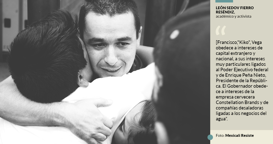 –Nosotros vemos que los gobernantes y funcionarios de prácticamente todo el país representan los intereses de los grandes capitales nacionales y extranjeros, en perjuicio del pueblo de México [...]. Son luchas de los pueblos contra los gobiernos que solo fingen la representación de pueblo, pero en realidad representan intereses del capital. "Kiko" Vega obedece a intereses de capital extranjero y nacional, a sus intereses muy particulares ligados al Poder Ejecutivo federal y de Enrique Peña Nieto, Presidente de la República. El Gobernador obedece a intereses de la empresa cervecera Constellation Brands y de compañías desaladoras ligadas a los negocios del agua. No tienen límites en la entrega de los recursos, están buscando las inversiones extranjeras, ofreciéndonos como una mercancía al mejor postor. Siempre andan buscando cómo hacer negocios y cómo lucrar con nuestros recursos, cómo explotar a la gente.