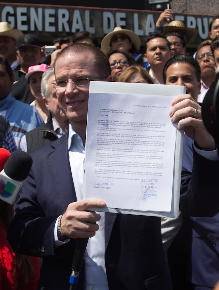 El 21 de febrero la Procuraduría General de la República (PGR) informó sobre una investigación por delito de operaciones con recursos de procedencia ilícita presuntamente efectuadas en una empresa del candidato de la coalición “Por México al frente”, Ricardo Anaya.