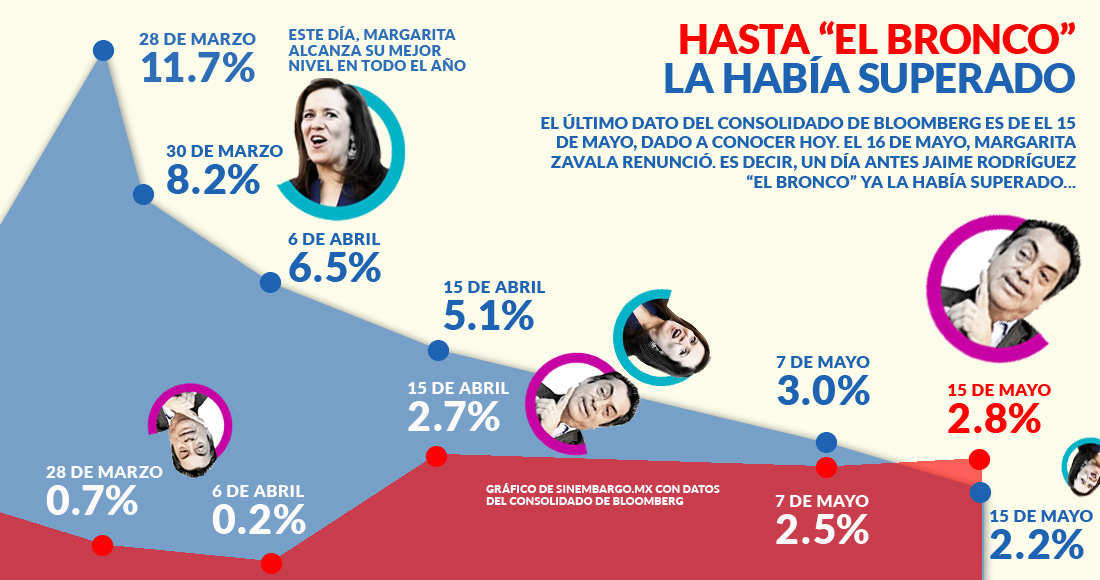 Con Margarita Zavala fuera de la contienda, Jaime Rodríguez Calderón “El Bronco”, el otro independiente, se ha desplazado también de manera horizontal. Hoy tiene 2.8 por ciento. Pocas sorpresas con el Gobernador de Nuevo León con licencia.