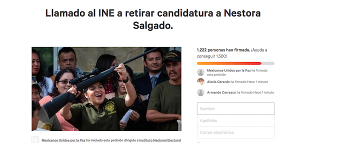 A través change.org, el usuario "Mexicanos Unidos Por las Paz" hizo una llamado al órgano electoral para que no dé la candidatura a una "secuestradora", pues –reza el texto– sería premiar a esta "delincuente".