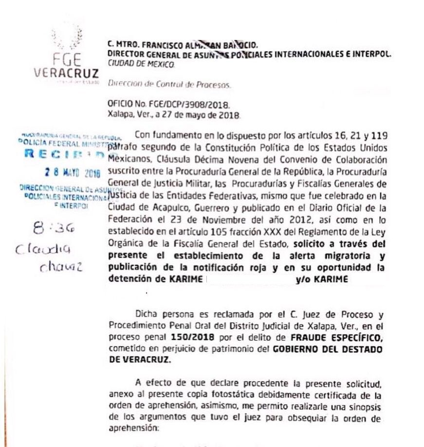 Ciudad de México, 28 de mayo (SinEmbargo).- La Fiscalía General del Estado (FGE) de Veracruz solicitó de manera formal a la Procuraduría General de la República (PGR) el establecimiento de una Alerta migratoria y la emisión de una Ficha Roja, a fin de localizar y detener a Karime Macías, ex Presidenta del Sistema para el Desarrollo Integral de la Familia (DIF) de la entidad.