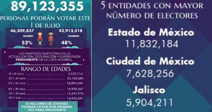 Asimismo, los jóvenes que votarán por primera vez (que rondan los 18 y 19 años,) son 3 millones 533 mil 714, de acuerdo con el INE .