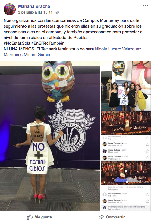 Puebla/Ciudad de México, 5 de junio (PeriódicoCentral/SinEmbargo).- Cuatro estudiantes del Tecnológico de Monterrey, campus Puebla, aprovecharon su ceremonia de graduación para protestar en contra de los 49 feminicidios que hasta la fecha se han registrado en la entidad poblana.