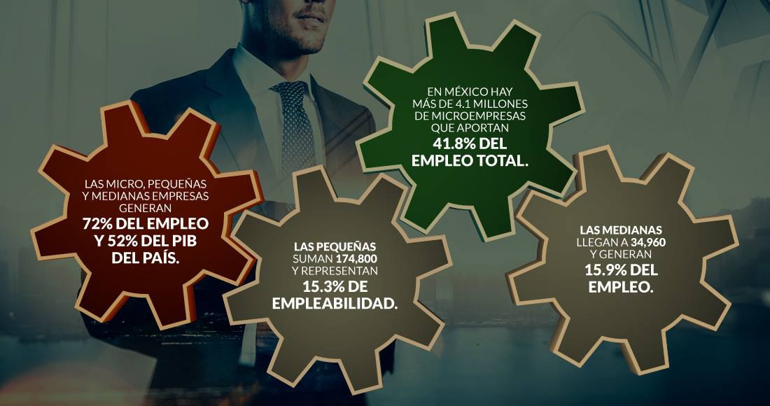 Las más de 4 millones de micro, pequeñas y medianas empresas generan el 72 por ciento del empleo formal y aportan el 52 por ciento del Producto Interno Bruto (PIB) del país, de acuerdo con la Comisión Nacional para la Protección y Defensa de los Usuarios de Servicios Financieros (Condusef). En México hay más de 4.1 millones de microempresas que aportan el 41.8 por ciento del empleo total. Las pequeñas suman 174 mil 800 y representan 15.3 por ciento de empleabilidad, y las medianas llegan a 34 mil 960 y generan 15.9 por ciento del empleo.