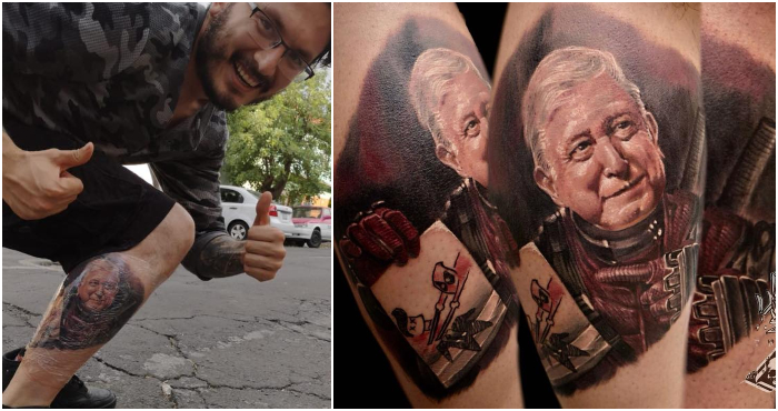 En el tatuaje, creado por Iker Abiatti, se ve a “López Obrador” con un boceto en la mano en el que se ve a Deadpool usando una catanas contra una caricatura del Presidente Enrique Peña Nieto.