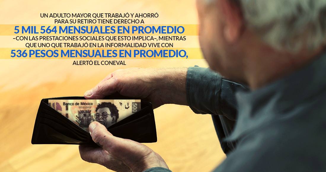 Ciudad de México, 11 de junio (SinEmbargo).– Un adulto mayor que trabajó y ahorró para su retiro tiene derecho a 5 mil 564 mensuales en promedio, mientras que uno que trabajó en la informalidad vive con 536 pesos mensuales en promedio, revelan cifras del Consejo Nacional de Evaluación de la Política de Desarrollo Social (Coneval).