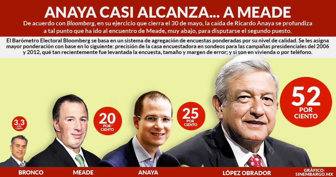 Anaya Cortés, de la coalición “Al Frente por México”, bajó su registro del mes de mayo 4 puntos, de 33 por ciento a 29 de este mes, lo que confirma el consolidado de Bloomberg.