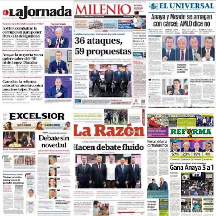 En El Universal: Anaya y Meade amagan con cárcel; AMLO dice no. Entre acusaciones de corrupción, investigaciones judiciales y desafíos a dejar la candidatura transcurrió el tercer y último debate presidencial entre Andrés Manuel López Obrador, Ricardo Anaya, José Antonio Meade y Jaime Rodríguez Calderón, El Bronco. El novedoso formato hizo uso de las redes sociales para que los ciudadanos cuestionaran a los presidenciables.