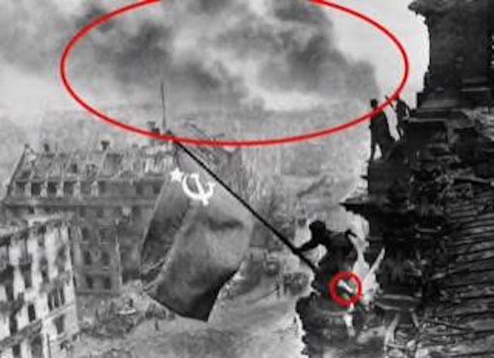 Se dice, y con razón, que la historia la escriben los vencedores. La imagen no podía ser más contundente. Era la mañana del 30 de abril de 1945. Un soldado del ejército soviético iza la bandera roja con la hoz y el martillo sobre el Reichstag berlinés. Pasaría a la historia como uno de los símbolos de la derrota del ejército nazi. Yevgueni Jaldéi (Ucrania, 1917-1997) fue el fotógrafo. Para conseguirlo tuvo que jugarse la vida y usar toda su creatividad. Las horas que precedieron a este acontecimiento merecen ser contadas. ¿En una ciudad devastada por las bombas, quién podía tener en su poder una bandera soviética?. Hoy sabemos que días después de que los ejércitos alemanes se rindieran hubo que crear la imagen icónica que representara el triunfo soviético. El joven fotógrafo recorrió la ciudad para encontrar un trozo de tela roja, luego se las vio negras para conseguir una costurera que tuviera la habilidad de bordar los símbolos en la bandera. Tuvo que apalabrarse con uno de los soldados para que ayudara al protagonista de la foto a colocarla. En la imagen original podemos observar dos cosas que llaman la atención: la primera, el paisaje no tenía humo, había que modificar la imagen y agregarlo para así mostrar la derrota. La segunda y más grave, el hombre que ayuda a sostener al soldado porta relojes en ambas muñecas. Con esto quedaba clara la rapiña en la ciudad caída. Después de revisar acusiosamente la impresión se le ordenó a Jaldéi (se pronuncia Kaldei) a “maquillarla”. Así, esta ilusoria imagen recorrió el mundo y pudo hablar más que mil palabras del triunfo del Soviet sobre los nazis.