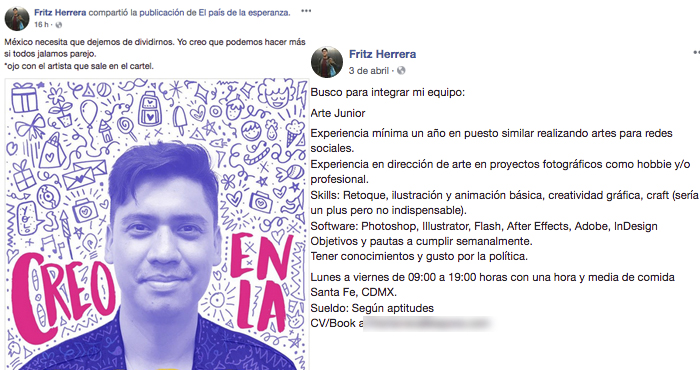 El usuario, tas ser contactado por SinEmbargo, eliminó una publicación en la que da su imagen a la página "El país de la esperanza", el mismo perfil muestra de manera pública mensajes de reclutamiento para integrar equipos de trabajo relacioandos a contenidos políticos en redes sociales. Foto: Facebook/FritzHerrera