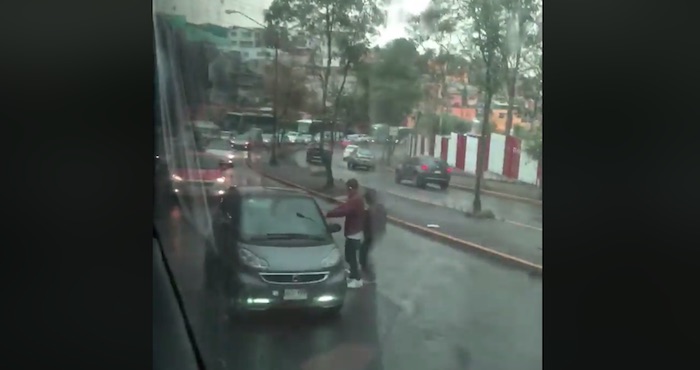 En el audiovisual se puede observar a tres sujetos corriendo de un lado a otro para asaltar al mayor número de conductores posibles, uno de ellos cuenta con un cubre bocas y una pistola.