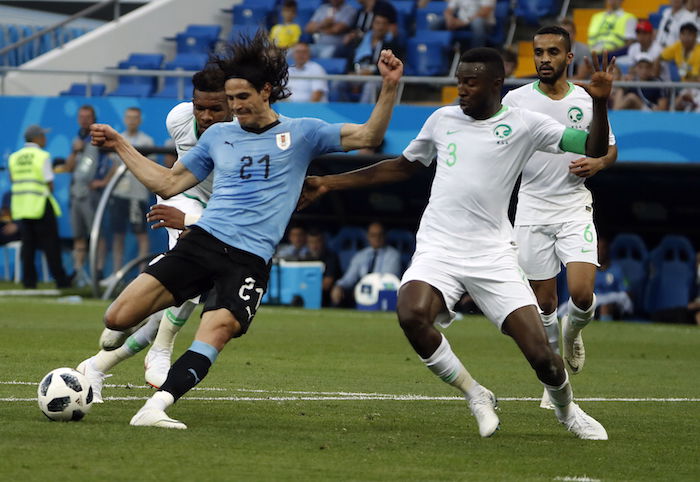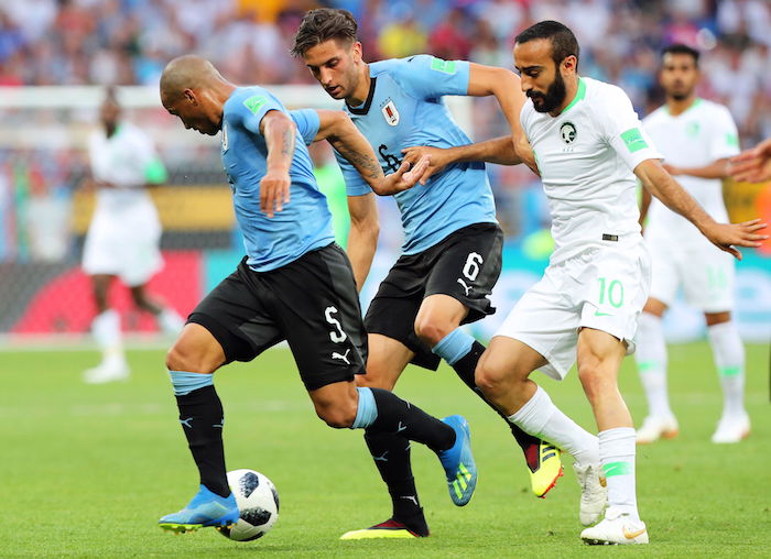 Enfrente, Arabia Saudita, que fue goleado en su presentación por los rusos, esta vez, tocaron mejor la pelota, mostraron mejor futbol y hasta tocaron la puerta del guardameta de la selección uruguaya, Muslera, nacido en Argentina, pero de padres "charrúas", pero para su mala fortuna no cuentan con un jugador de la talla del propio Luis Suárez, Edison Cavani y el propio Diego Godín, cuando va en busca de los saques de esquina.