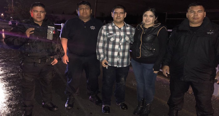Los oficiales Candelario Córdoba Arias, Jesús Leonardo Martínez y Cesar Enrique Perales Constancio pusieron a salvo a Luis Ermilo Hernández y a Edna Aguirre, quienes se dirigían a un convivio pero fueron sorprendidos por la lluvia torrencial que de ayer en la ciudad.