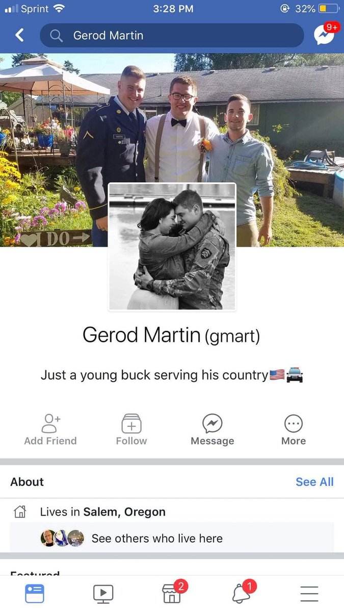 Las capturas de pantalla de la página del agente Gerod Martin lo muestran con su uniforme de la Guardia Nacional de Oregon en su foto de perfil. “Sólo un joven que sirve a su país”, se puede leer en la página.