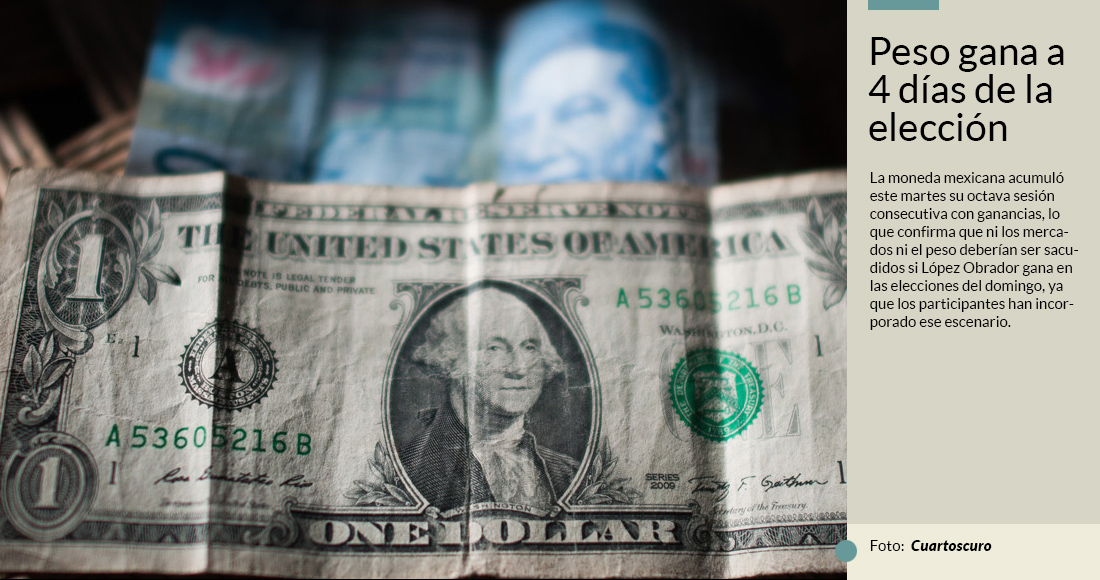 La moneda mexicana acumuló este martes su octava sesión consecutiva con ganancias, lo que confirma que ni los mercados ni el peso deberían ser sacudidos si López Obrador gana en las elecciones del domingo, ya que los participantes han incorporado ese escenario.