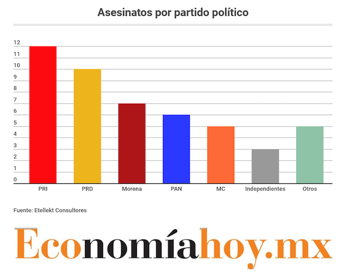 Los asesinatos exclusivos de precandidatos y candidatos en la presente contienda electoral ascienden a 48, donde el PRI tiene el mayor número de descensos con un total de 12, seguido del PRD con 10, Morena con siete, el PAN con seis, Movimiento Ciudadano con 5 y 3 independientes.
