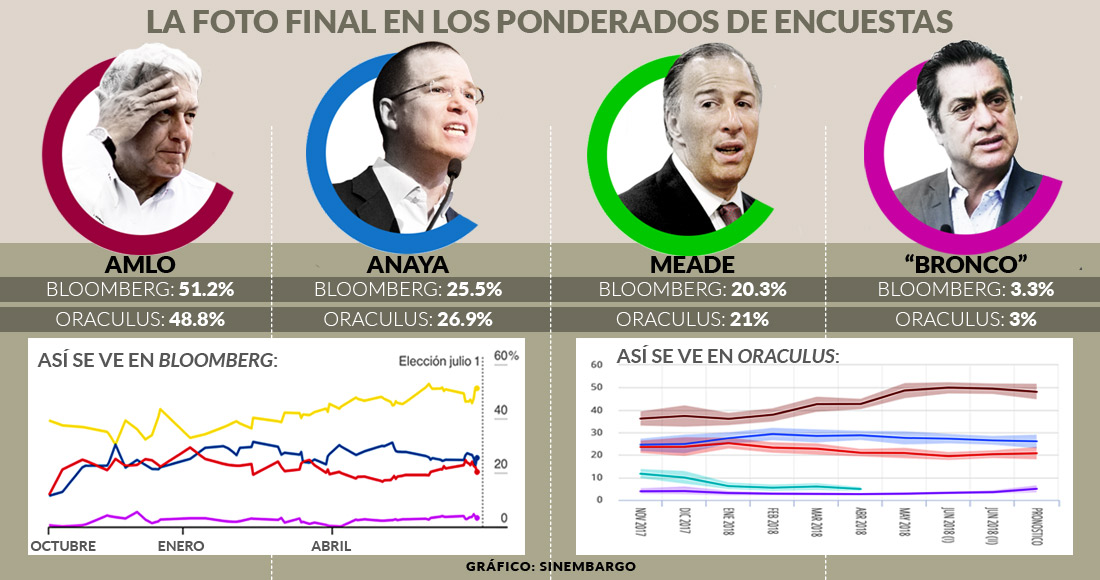 Bloomberg explica: “Las encuestas que están llegando hoy se ven bien para Andrés Manuel López Obrador. El candidato de izquierda tiene una ventaja de dos a uno sobre el segundo lugar, Ricardo Anaya, con un margen de 26 puntos porcentuales en nuestro Barómetro Electoral Bloomberg, que asigna diferentes pesos a la mayoría de las encuestas públicas. Las más recientes en el agregador son: Reforma, El Financiero, Suasor, Parametría y BGC”.