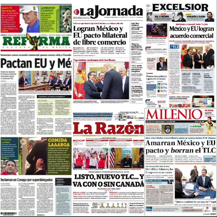 En el Excélsior: México y EU logran acuerdo comercial. Los equipos negociadores de México y Estados Unidos para el Tratado de Libre Comercio de América del Norte (TLCAN) alcanzaron un acuerdo comercial entre ambos países. Sólo faltará que Canadá decida integrarse para cerrar el pacto de manera trilateral.