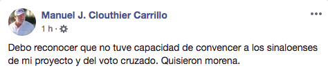 Manuel Clouthier Carrillo, candidato independiente al Senado de la República por Sinaloa, reconoció su derrota en la contienda electoral de este domingo, debido a que, consideró, no haber tenido la capacidad de convencer a la gente de su proyecto. En su perfil de Facebook, Clouthier Carrillo aseguró que los sinaloenses quisieron al Movimiento de Regeneración Nacional (Morena). Mientras que en su cuenta de Twitter, señaló que el futuro Gobierno de Andrés Manuel López Obrador no tendrá pretextos. "Esperamos no se pierdan en la soberbia, la frivolidad del triunfo y la tentación de la corrupción. Por lo pronto parece que a México le falta tocar fondo", sostuvo.