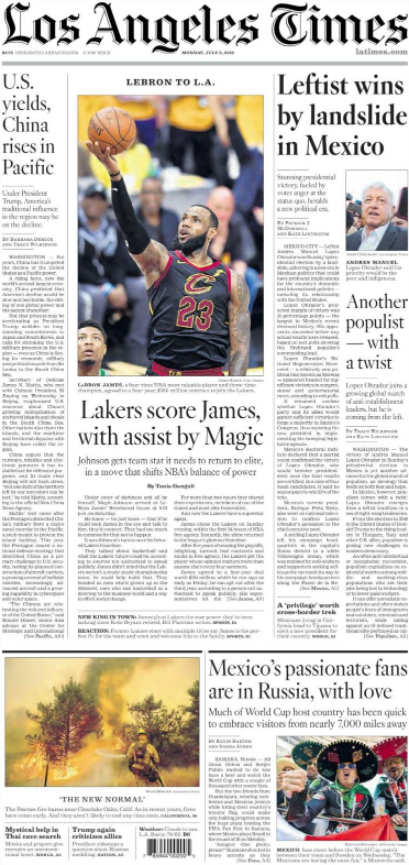La portada de Los Angeles Times también recuperó los resultados preliminares de las elecciones presidenciales con un texto en el que califica de "aplastante" el triunfo de Andrés Manuel López Obrador después de pasar más de 12 años en busca del más alto cargo público en el país. "Después de dos derrotas, su autodisciplina y su horario de campaña tenaz y casi constante finalmente dieron sus frutos", aseguró el medio. Además, recordó las actividades más destacadas de su carrera política y cómo dirigió su camino en este ámbito para no desaparecer de la vista de la gente en todos estos años.