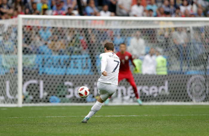 Sin embargo, los porteros habían tenido una jornada tranquila, hasta que en el minuto 40, Antoine Griezman cobró un tiro libre desde el sector derecho y envió la pelota a la altura del manchón penal, donde llegó Raphaël Varane, y conectó con la cabeza ganando el salto a todos y la puso pegada al poste derecho, ante la estirada inútil de Muslera.