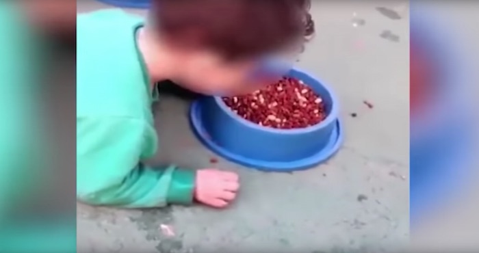 En las polémicas imágenes, se ve a un niño discapacitado de dos años de edad inducido por su propia madre a comer comida para perros del plato de un can.