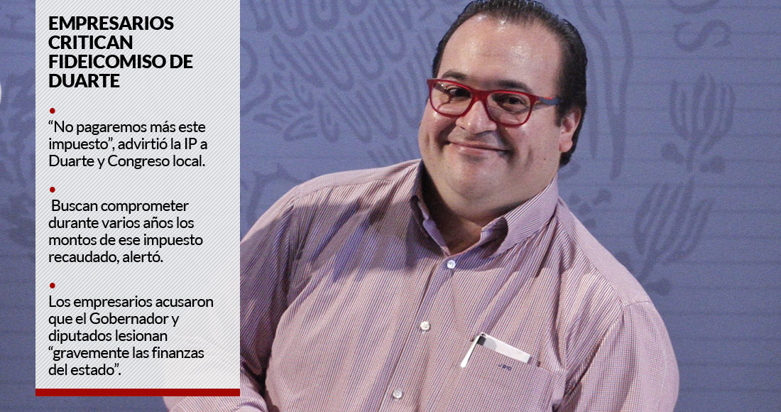 El 17 de julio de 2016, los empresarios estatales anunciaron que dejarían de pagar el Impuesto a la Nómina o Impuesto Sobre la Renta, luego de que Duarte de Ochoa anunciara una iniciativa para que esos recursos se usaran para pagar deuda y no infraestructura, además de que para entonces ya tenían registro de una alta morosidad con compañías que le habían dado servicio a su administración.