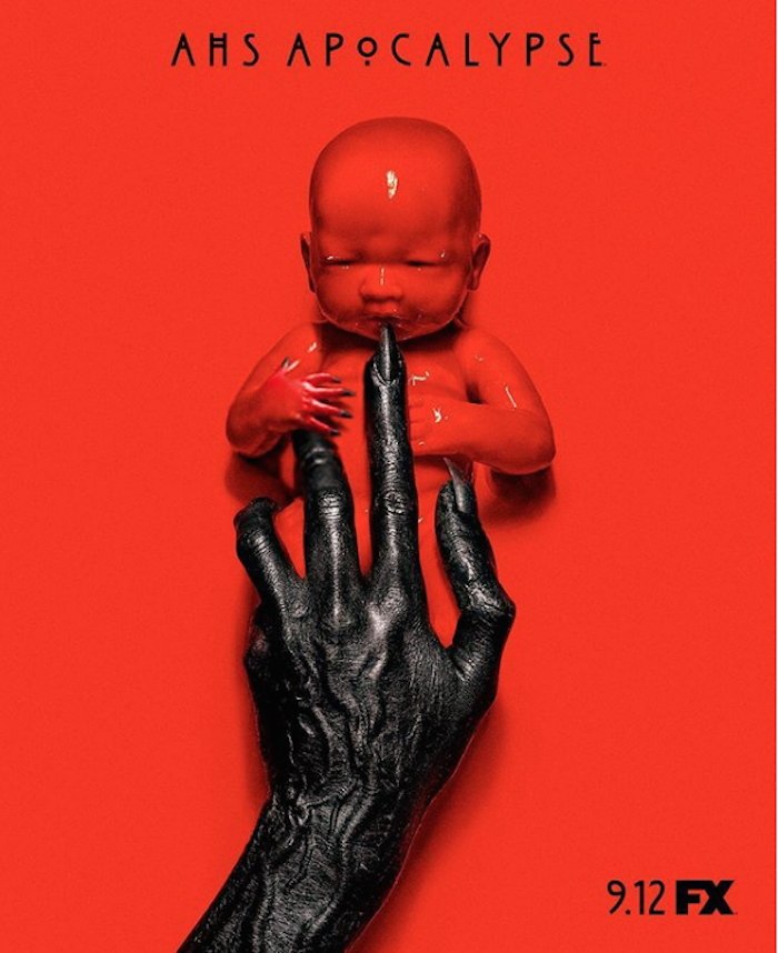 El color rojo baña por completo la instantánea, tanto en el fondo como en el bebé que la protagoniza. Solo las uñas de éste y la siniestra mano que le acaricia rompen con el rojo para dar un toque negro a la imagen. El mismo con el que aparece escrito AHS: Apocalypse, título de esta nueva tanda de capítulos que llegará a FX el próximo 12 de septiembre.