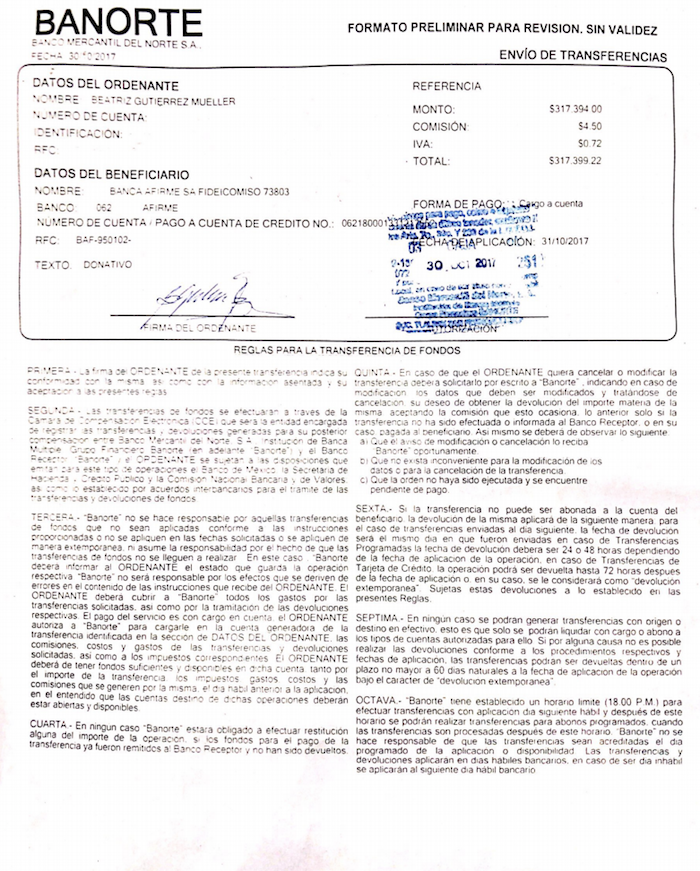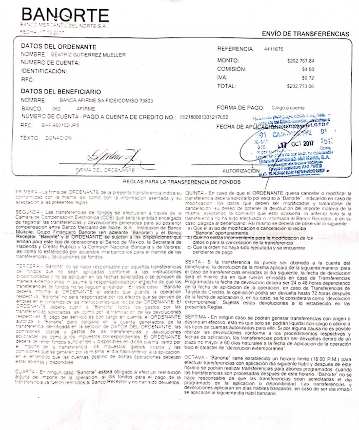 Entregó dos comprobantes, uno del 17 de octubre, por 202 mil 273 pesos con seis centavos; y otro del 30 de octubre por 317 mil 399 pesos con 22 centavos. Los dos donativos que en días pasados dijo que hizo al Fideicomiso.