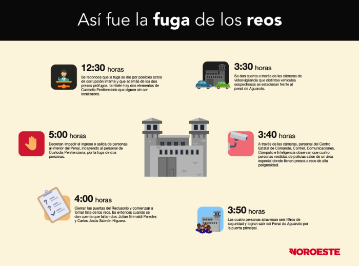 El hecho ocurrió a las 3:40 horas del domingo. En ese momento se detectó la llegada de distintos vehículos a las afueras del penal. Minutos antes se observó desde el Centro Estatal de Comando, Control, Comunicaciones, Cómputo e Inteligencia la salida de cuatro personas con uniforme de Custodia Penitenciaria de una de las áreas de la prisión.