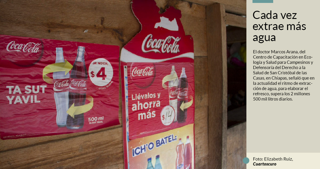 El doctor Marcos Arana, del Centro de Capacitación en Ecología y Salud para Campesinos y Defensoría del Derecho a la Salud de ese municipio, señaló que en la actualidad el ritmo de extracción de agua supera los 2 millones 500 mil litros diarios en la zona. Explicó que la Comisión Nacional del Agua (Conagua) ha otorgado la renovación y ampliación de concesiones a "Inmobiliaria del Golfo SA de CV”, razón social utilizada por Coca-Cola Femsa en Chiapas, sin consultar a los habitantes del municipio y sin transparencia.