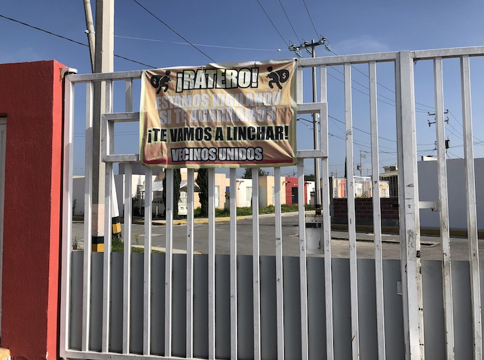 "Vecinos vigilantes", "si te agarramos, te linchamos", se puede leer en las pancartas que colocan las pocas personas que todavía residen en los fraccionamientos otorgados con créditos Infonavit.