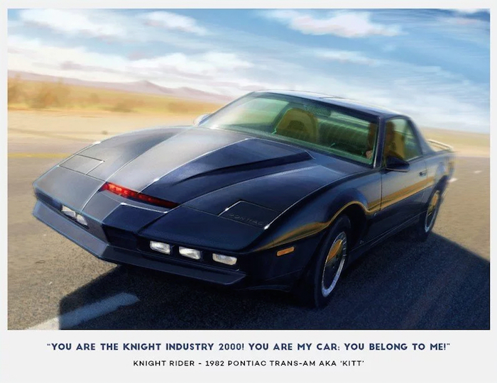 El Knight Rider Two Thousand, o KITT, era un personaje en sí mismo. La inteligencia artificial de KITT le permitió hablar con Michael Knight, creando la asociación que definió la historia. El elegante cuerpo negro y el bajo marco le daban un aspecto futurista, combinado con la capacidad de conducir a través de su 'circuito alfa', soportar temperaturas de más de 400C con laminación piroclástica y alcanzar 60 mph en dos segundos, gracias a una transmisión turbodrive . Fuera de la pantalla, KITT fue uno de varios Pontiac Trans-Ams de 1982, algunos de los cuales estaban equipados con cuerpos ligeros de fibra de vidrio para facilitar las acrobacias.