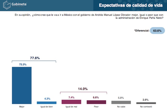 Las expectativas de mejorar la calidad de vida durante el gobierno de López Obrador son altas, el 73.3 por ciento considera que le va a ir mejor en este nuevo sexenio, y el 4.3 por ciento piensa que “igual de bien”.