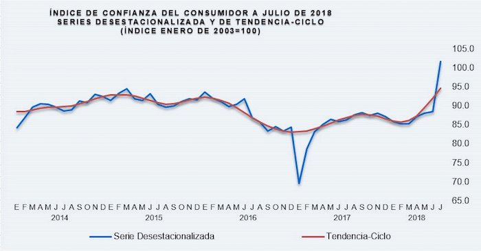 Los cinco componentes que integran el Índice de Confianza del Consumidor presentaron un avance, por lo que este indicador creció un 14.8 por ciento en comparación con el mes anterior, y 17.8 por ciento frente a julio de 2017.