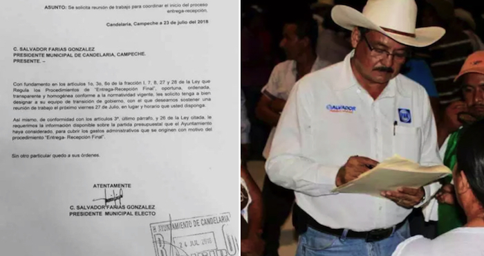 Ciudad de México, 3 de agosto (LaOpinión/SinEmbargo).-“Deseamos sostener una reunión de trabajo el próximo 27 de julio en lugar y horario que usted disponga”, escribió el Alcalde de Candelaria, Campeche (sureste), Salvador Farías, con el objetivo de iniciar formalmente el proceso de entrega- recepción de poder al concluir un periodo de gobierno.