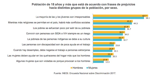 Entre los prejuicios identificados en la encuesta, se ve que en todas las entidades del país más del 44 por ciento de la población mencionó estar de acuerdo con que "todos los jóvenes son irresponsables".