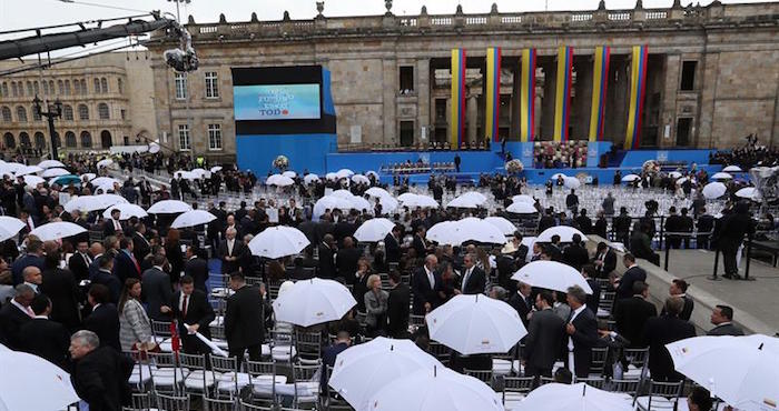 Debido a la lluvia que por momentos amenazaba con tormenta, los asistentes tuvieron que usar los paraguas blancos distribuidos por el Gobierno colombiano y que fueron zarandeados por ráfagas de viento.