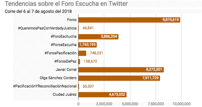 En el monitoreo realizado en tiempo real por la Unidad de #MetaDatos de este diario digital se identificaron al menos 10 tendencias muy similares que se posicionaron en esa red social . Este comportamiento tuvo su origen en la participación de varios grupos que nombraron el evento de distintas maneras: lo que para unos era un encuentro de #ForosDePacificación, para otros era el #ForoEscucha o #ForoDePaz. La dispersión se incrementó con el cambio de plural a singular en los hashtags, y la tendencia “Ciudad Juárez” que movilizaron sobre todo los medios de comunicación.