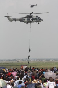 TECAMAC, ESTADO DE MÉXICO, 25AGOSTO2012.- Miles de personas presenciaron la exhibición aérea La Gran Fuerza de México, de parte de Elementos de la Fuerza Aérea y elementos del Ejercito, la cual consiste en vuelos de formación, bombardeos simulados de aeronaves, saltos en paracaídas, acrobacia de aeronaves y operaciones aeromóviles en las instalaciones de la Base Aérea Militar No. 1 en Santa Lucía.