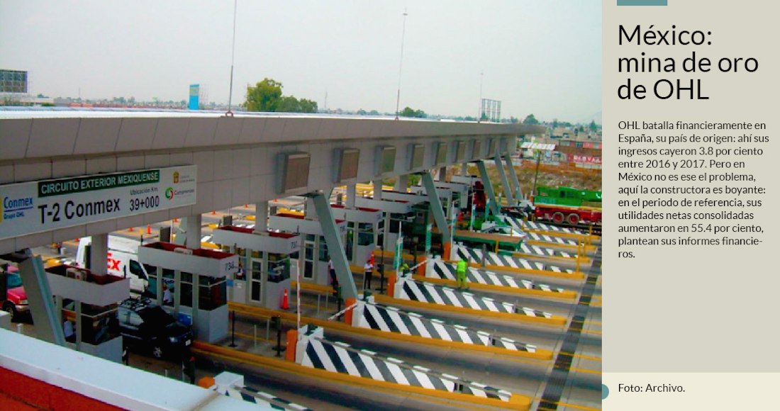 En la actualidad, OHL batalla para salir a flote. Mientras que en su país de origen sus ingresos cayeron 3.8 por ciento entre 2016 y 2017, aquí, en el mismo periodo, sus utilidades netas consolidadas aumentaron en 55.4 por ciento, refieren sus informes financieros.