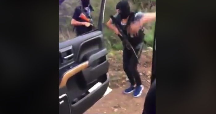En las imágenes se aprecia a los presuntos narcos, con sus armas largas, aparentemente fusiles de asalto. El vehículo utilizado para este "Chona” es una camioneta.