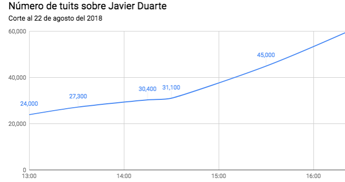 #MetaDatos | Javier Duarte de Ochoa acaparó las redes sociales, y su nombre se colocó incluso como tendencia mundial en Twitter por 15 horas. En ese lapso se acumularon al menos 60 mil tuits que aludían la situación judicial del ahora ex priista y ex Gobernador de Veracruz.