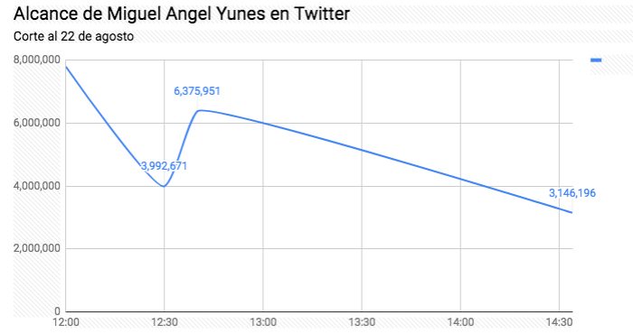 A las 12:00 horas, la difusión del mensaje del mandatario panista a través de medios de comunicación tuvo un alcance de 7 millones 795 mil 503 cuentas.